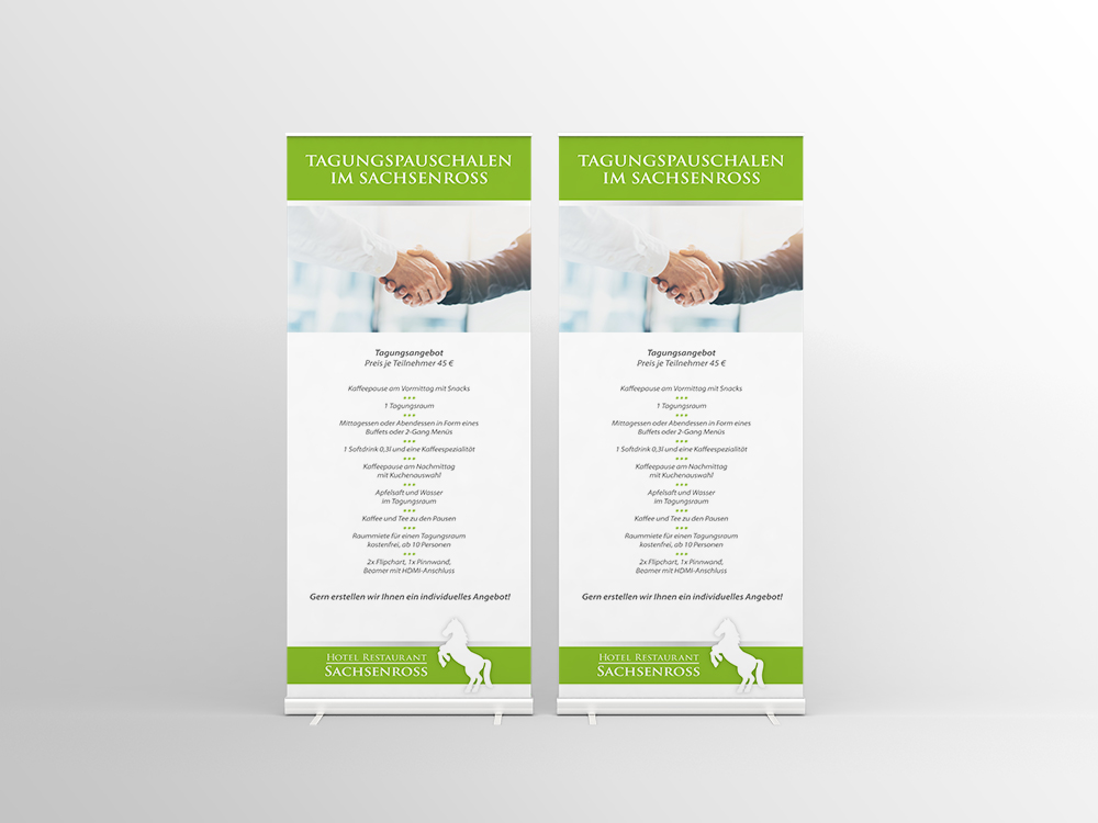 Auf die attraktiven Tagungsangebote des Hotel und Restaurant Sachsenross macht der neue Roll-up-Banner alle Gäste aufmerksam. In Layout und Farben stimmig zum gesamten Erscheinungsbild des Hauses präsentiert der Banner die aktuellsten Neuerungen und Angebote.