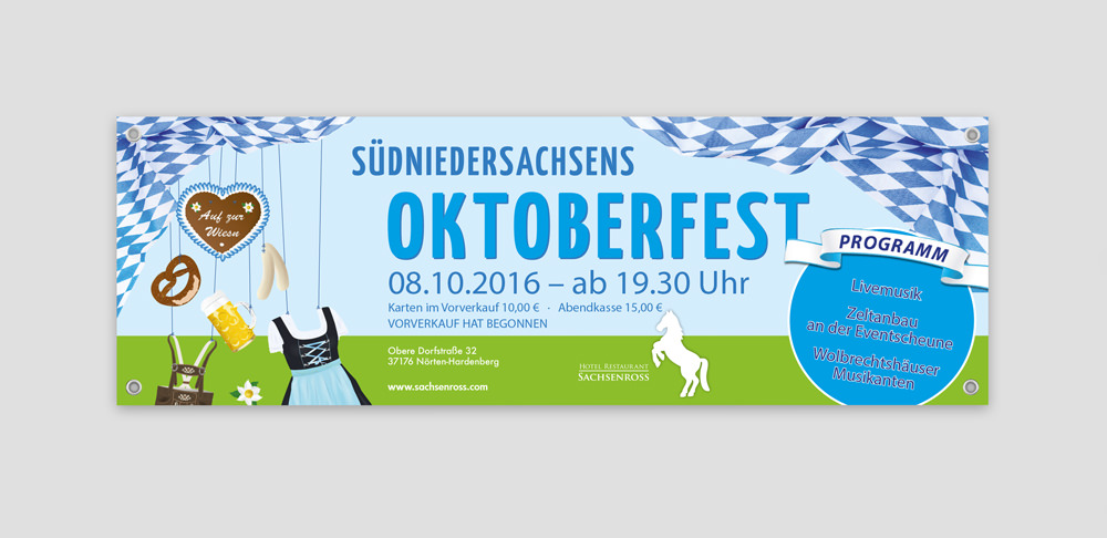 Sachsenross in gross: auch im Bannerformat hat SH Marketing in den letzten Wochen einige Werbematerialien für das Sachsenross gestaltet, so zum Beispiel ein Banner, welches für das diesjährige Oktoberfest wirbt und einen neutralen Image-Banner, der bei unterschiedlichen Anlässen und Locations zum Einsatz kommen wird.